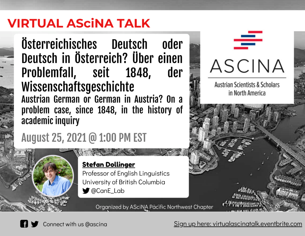 Stefan Dollinger is Full Professor of English Linguistics at UBC Vancouver, specializing in sociolinguistics, historical linguistics, and dialectology. The graduate of Vienna University’s Anglistik and Germanistik has held, before his Vancouver time, a Research Chair in Gothenburg, Sweden, and has researched in Kiel, Germany, Toronto, Canada, and is affiliate at UVic Linguistics in Victoria, BC. The author of more than 70 articles and field-specific contributions, has written a number of books, including The Written Questionnaire in Social Dialectology (Benjamins, 2016), Creating Canadian English (Cambridge UP, 2019), The Pluricentricity Debate: On Austrian German and Other Germanic Standard Varieties (Routledge, 2019) and, for the first time in German, Austrian German or German in Austria: Identities in the 21st Century (new academic press, 2021, in German). He is editor-in-chief of the second edition of A Dictionary of Canadianisms on Historical Principles (UBC, 2017; www.dchp.ca/dchp2). In 2008, we received the first Ascina-Award and he is most happy to return to Ascina with a talk today.